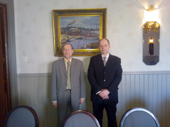 Vas. Veikko Räsänen ja tuomiokirja-hankkeen vastaava sekä tuomiokirja-tietokannan kehittäjä Reijo Luostarinen tunnustuksen jakotilaisuudessa (Valokuva: Ari Kankkunen).
